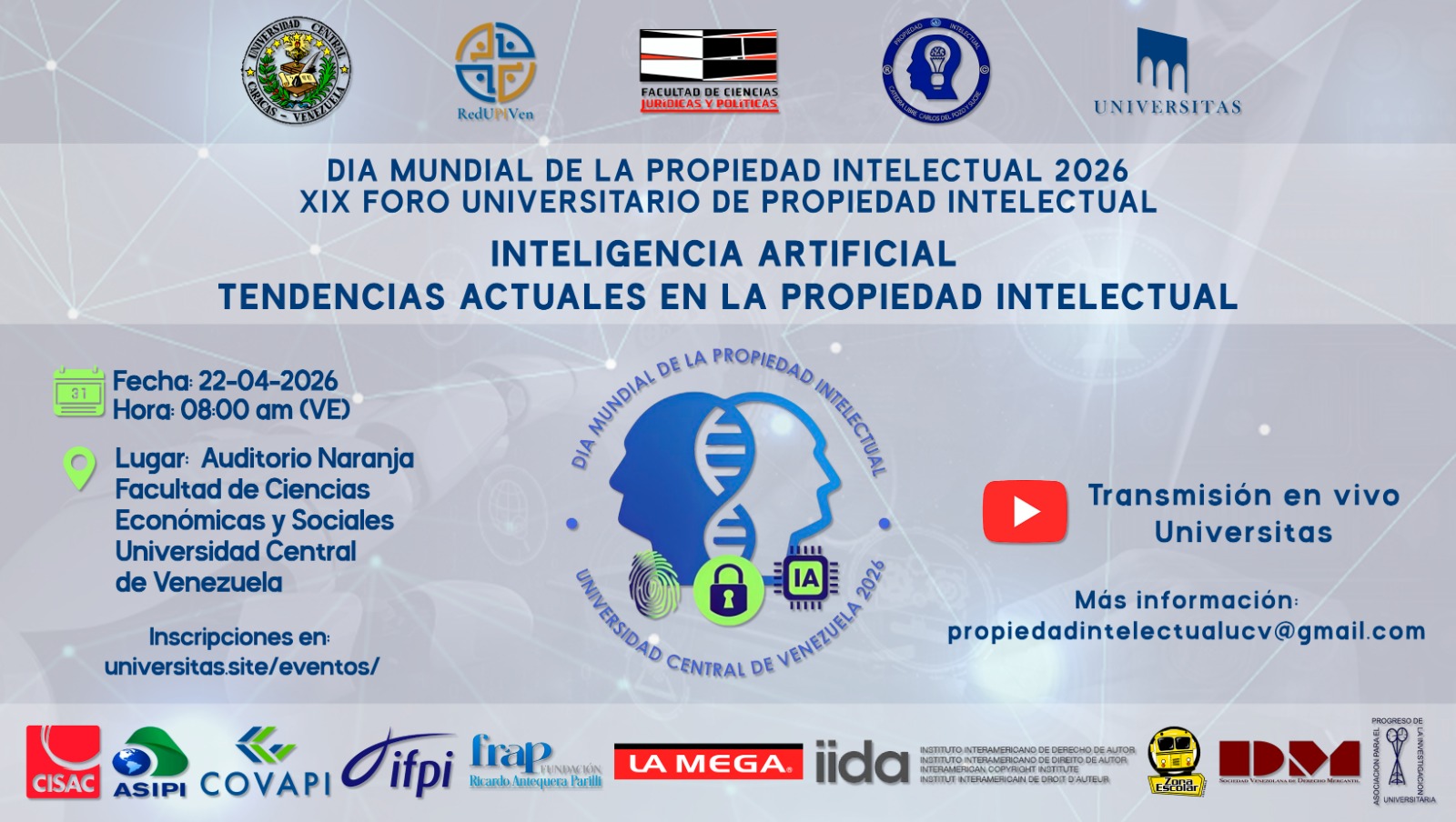 PROPIEDAD INTELECTUAL 2026Por / abril 13, 2026 PROPIEDAD INTELECTUAL 2026 Por Universitas 24 24 people viewed this event. Más información en: propiedadintelectualucv@gmail.com Regístrate al evento Para registrarse en este evento visite la siguiente URL https://universitas.myflodesk.com/propiedad-intelectual-2026 → Fecha 2026-04-22 / 08:00 AM Ubicación Evento virtual Event Types Foro Compartir con amigos Facebook Twitter Linkedin Xing Pinterest